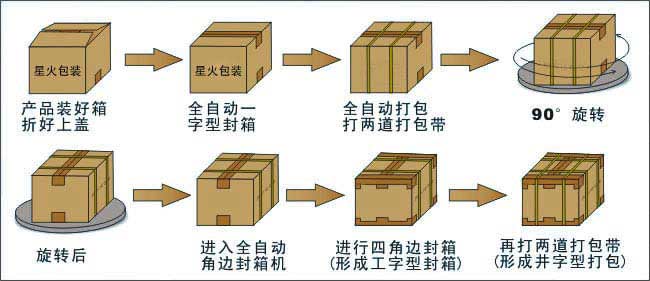 全自動(dòng)封箱打包生產(chǎn)流水線內(nèi)容本包裝生產(chǎn)流水線主要操作流程:已裝好產(chǎn)品折好上蓋的產(chǎn)品箱從左邊的滾筒進(jìn)入此流水線,進(jìn)入第一臺(tái)包裝機(jī)械:全自動(dòng)一字型封箱機(jī)(進(jìn)行一字型封箱)—→進(jìn)入第二臺(tái)包裝機(jī)械:全自動(dòng)打包機(jī)(打兩道打包帶)—→進(jìn)入第三臺(tái)包裝機(jī)械:90°旋轉(zhuǎn)機(jī)—→進(jìn)入第四臺(tái)包裝機(jī)械:全自動(dòng)角邊封箱機(jī)(進(jìn)入四角邊封箱,形成工字型封箱)—→進(jìn)入最后的第五臺(tái)包裝機(jī)械:全自動(dòng)打包機(jī)(打另外兩道的打包帶,形成井字形打包)—→工字型封箱+井字型打包完成。